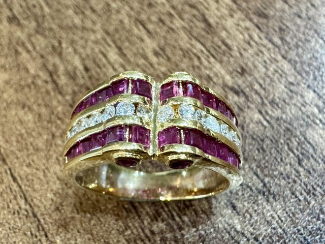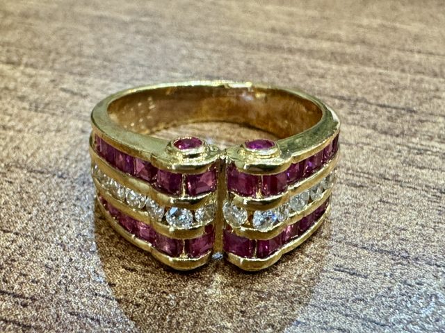 18金枠に ルビーと小さなダイヤが左右に14石並べてセッティングされた指輪です。