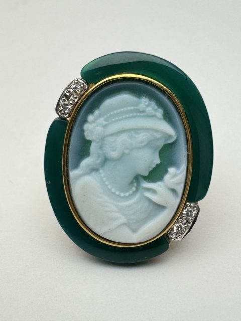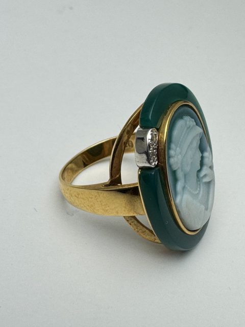 このカメオリングは、特にグリーンメノウに彫られた横顔が特徴で、アンティークな雰囲気と繊細な職人技が魅力です。