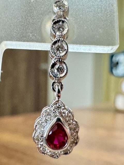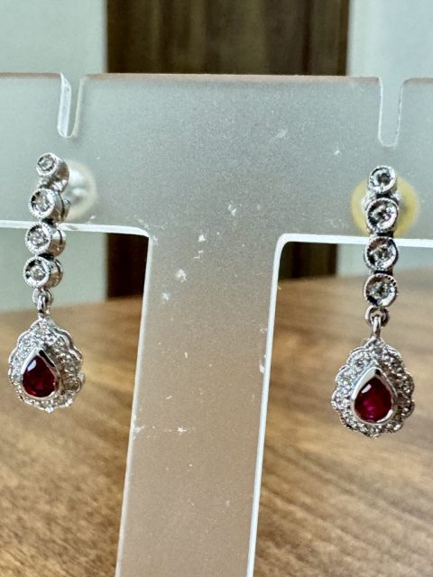 14金ホワイトゴールド枠に ルビーをメインに、周りに小さなダイヤを並べたピアスです。