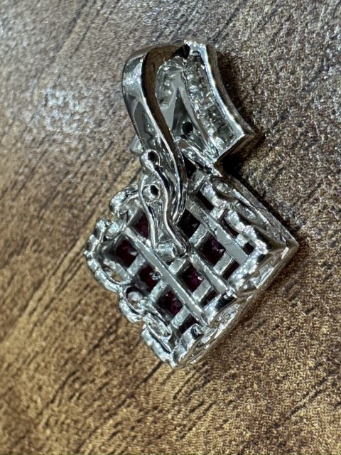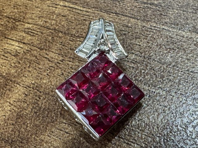 18金ホワイトゴールド枠に ミステリーセッティングしたルビーをメインに、上部に小さなダイヤを並べたペンダントです。