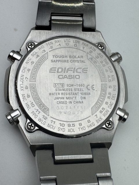 裏蓋には都市コードが刻印されており、シンプルながらスポーティな印象のフラットベゼルデザインを実現しています。