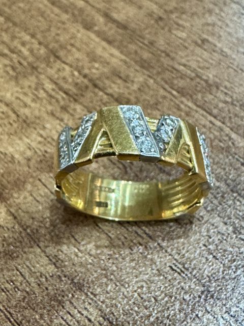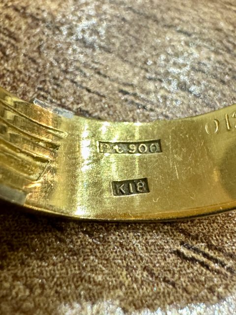 刻印を見るとK18とPt900がコンビで使用されており、プラチナのV字のデザイン部分には小さなダイヤモンドがセッティングされ、高級感漂う上質な指輪です。