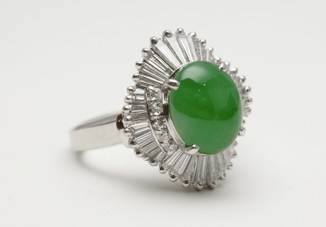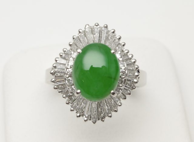 プラチナ枠の中央にカボションカットされた翡翠を配置し、その周囲をバゲットカットやラウンドカットのダイヤモンドで豪華に装飾したスタイルが特徴の指輪です。