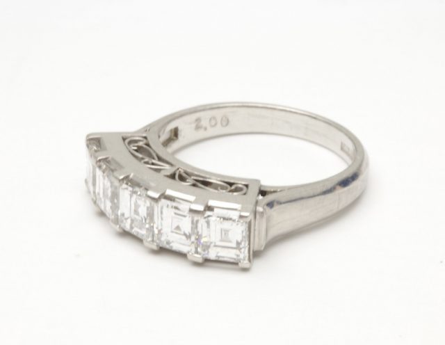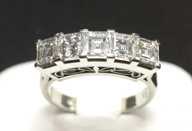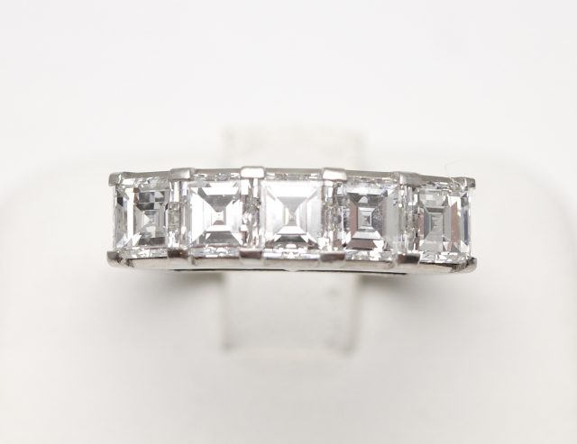 Pt900枠に、 バゲットカットのダイヤモンドが5石並んだ、プラチナ製の一文字リングです。