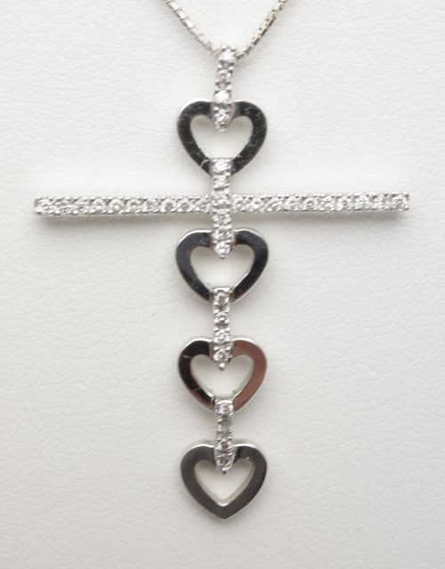 縦に並んだ4つのオープンハートと、それを横切るように配置されたダイヤモンドを敷き詰めたクロスが組み合わさったデザインが特徴的です。