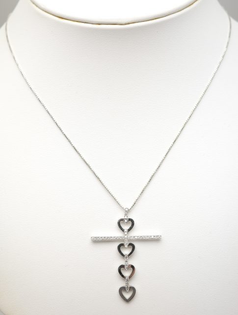 本日お持ちいただいたのは、ハートとダイヤモンドをあしらったK18ホワイトゴールドのクロスネックレスです。